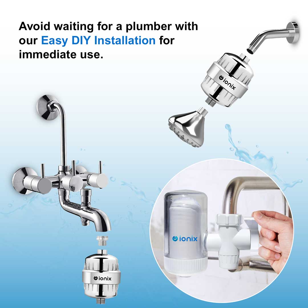 Upgrade Your Water Quality throughout your flat with Ionix Combo kit for Hard Water The Ionix Water Filter System Combo Kit provides a complete water purification solution designed for urban flats. This kit is designed to purify all incoming water, ensuring high-quality water at your kitchen tap, wash basin, bathroom, and washing machine and geyser as well. With easy DIY installation and long-lasting performance, the Ionix Water Filter System Combo Kit promotes a healthier, happier lifestyle for your entire family.