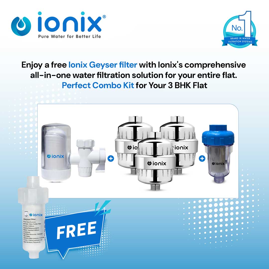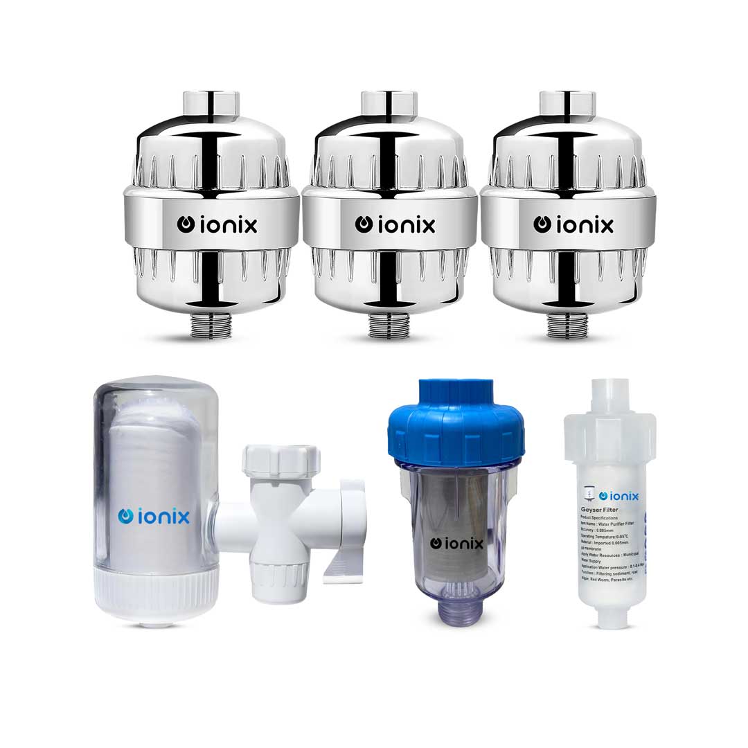 Upgrade Your Water Quality throughout your flat with Ionix Combo kit for Hard Water The Ionix Water Filter System Combo Kit provides a complete water purification solution designed for urban flats. This kit is designed to purify all incoming water, ensuring high-quality water at your kitchen tap, wash basin, bathroom, and washing machine and geyser as well. With easy DIY installation and long-lasting performance, the Ionix Water Filter System Combo Kit promotes a healthier, happier lifestyle for your entire family.