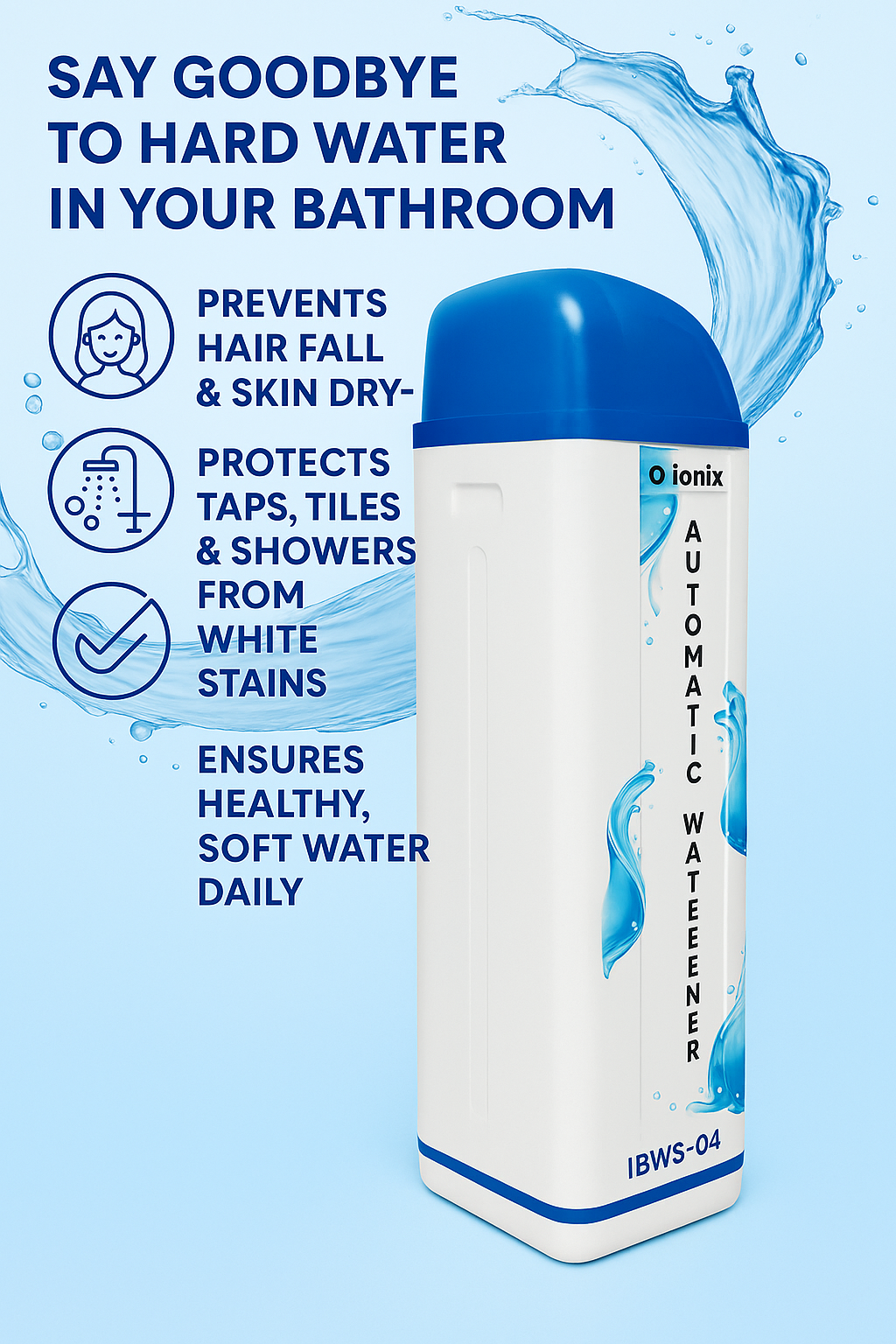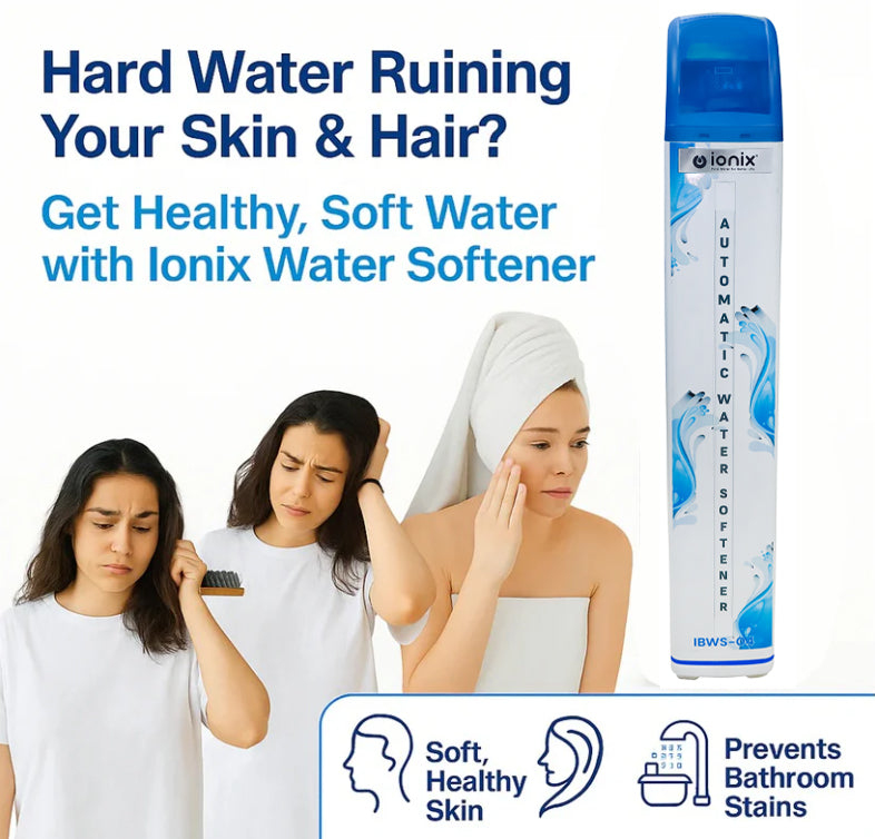 Hard water can lead to hair fall, skin dryness, and stubborn white limescale deposits on taps, tiles, and showers. The Ionix softener effectively prevents all these by automatically converting hard water into soft water at the source.