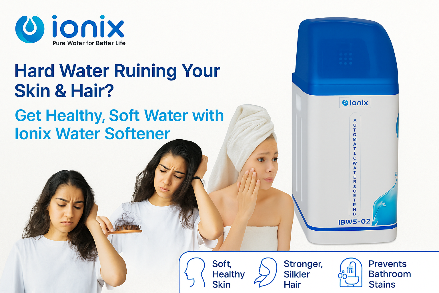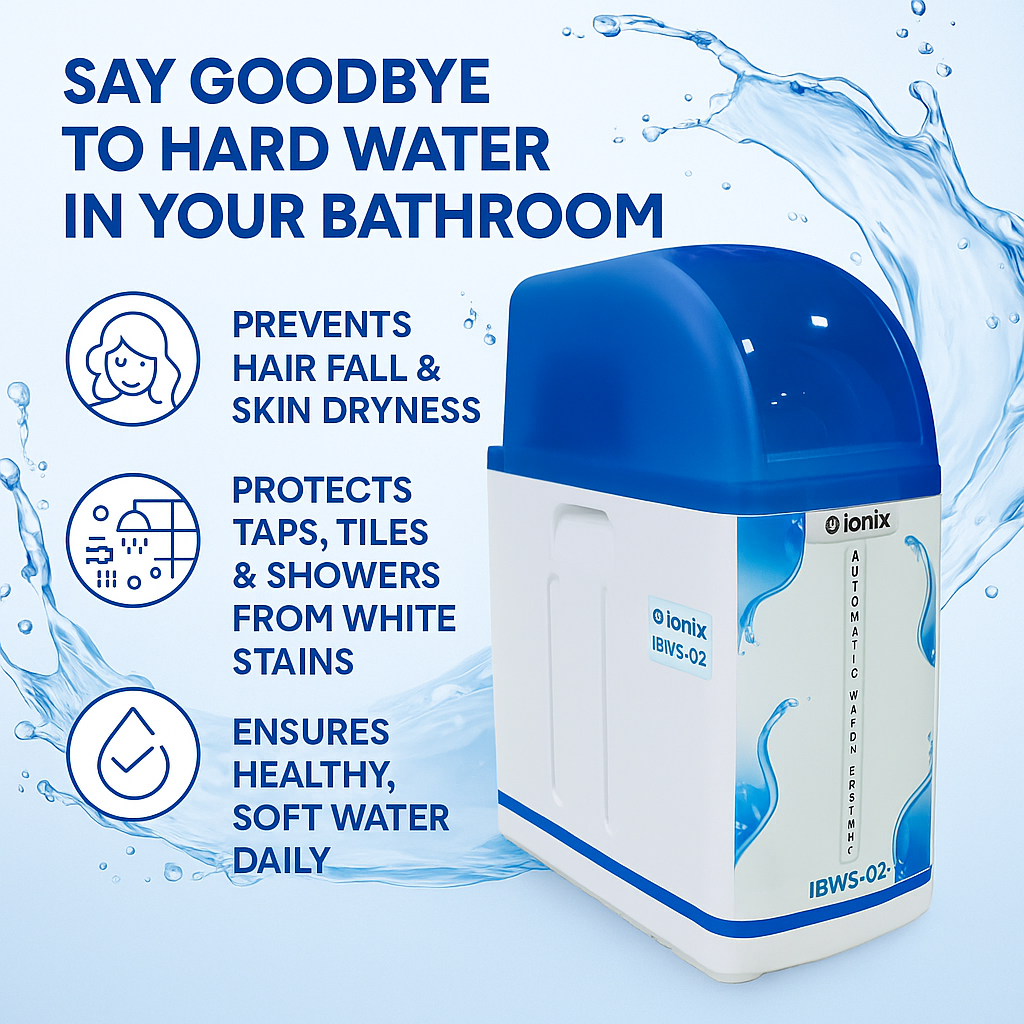 Hard water often causes hair fall, skin dryness, roughness, and stubborn white limescale deposits on taps, tiles, and showers. Ionix softener prevents all these by converting hard water into soft water automatically.